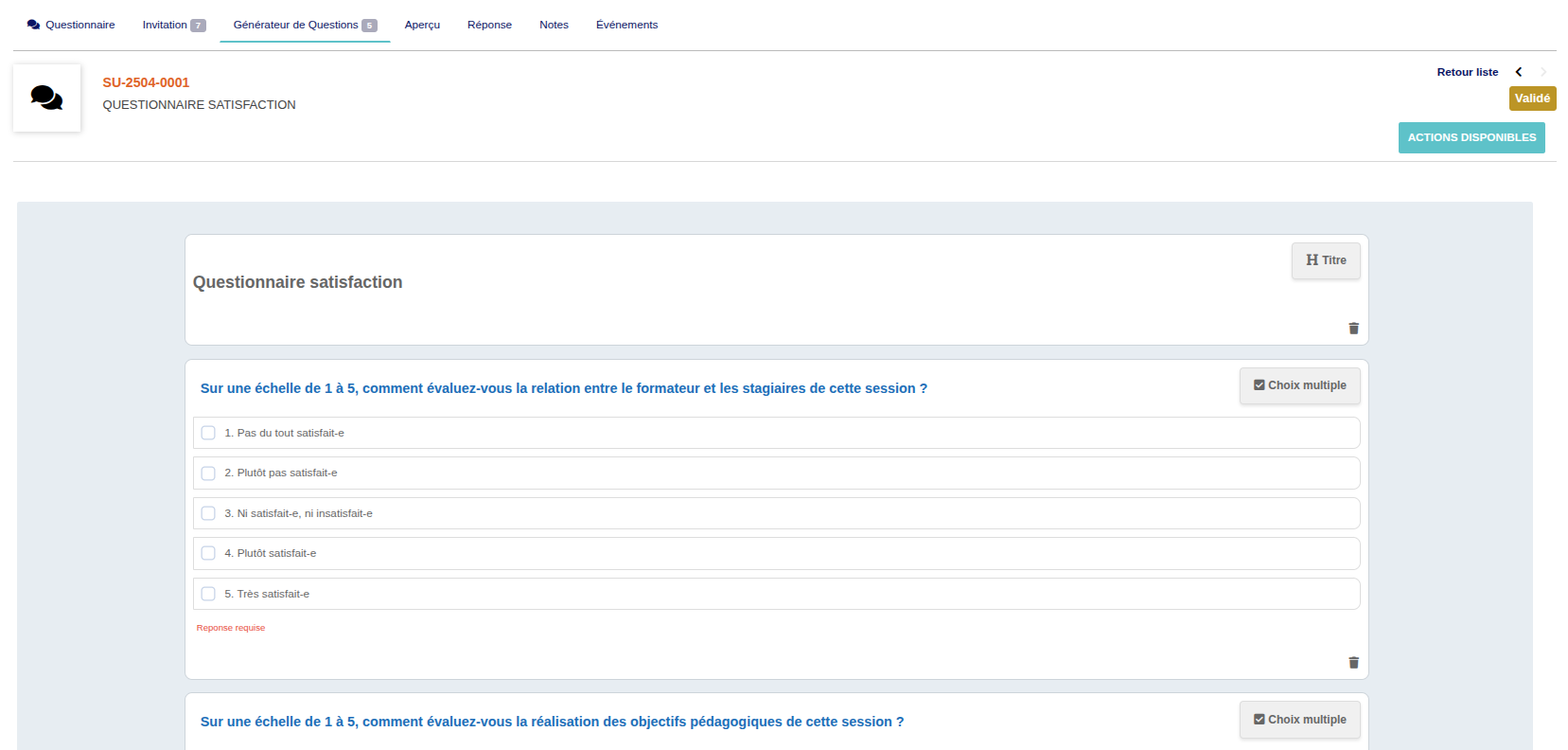 | 3.6 / 3.7 Évaluation des acquis et satisfaction | Module Questionnaire (évaluation à chaud, à froid, QCM) |
