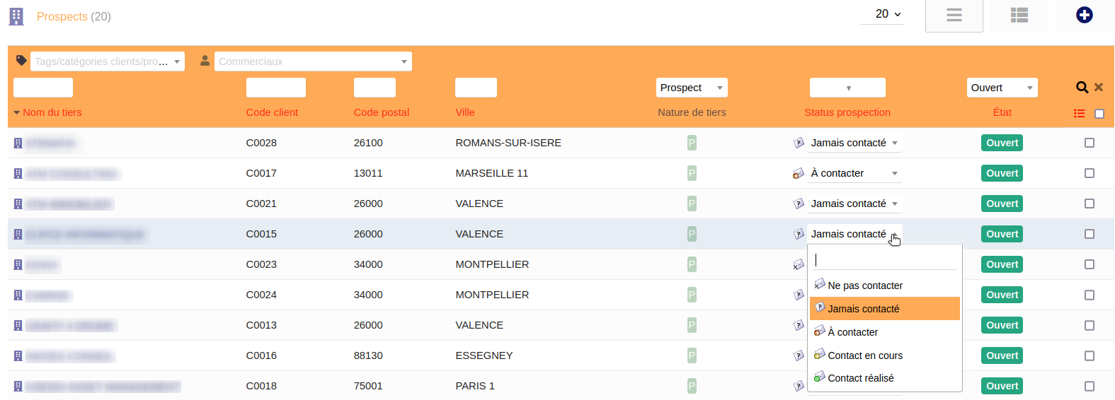 - Ajout de la possibilité de modifier le statut de prospection d’un tiers directement depuis la liste